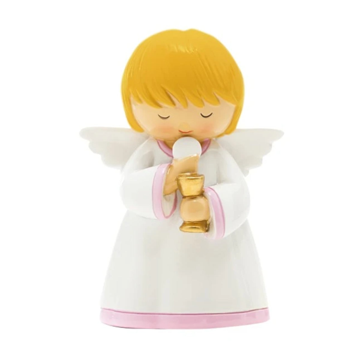 A Sagrada Comunhão é o bem mais precioso e o mais abençoado Sacramento que nos é dado por Jesus Cristo. É o Corpo e o Sangue, a Alma e a Divindade de Jesus, que estão verdadeiramente presentes sob a aparência de pão e vinho, oferecidos na Missa. A Sagrada Comunhão dá-nos a oportunidade de nos unirmos a Deus, não apenas espiritualmente, mas fisicamente, levando-O para os nossos corações. Este Anjo da Guarda, com o Corpo e Sangue de Jesus, é uma lembrança do dia especial em que cada criança recebe a Primeira Comunhão.