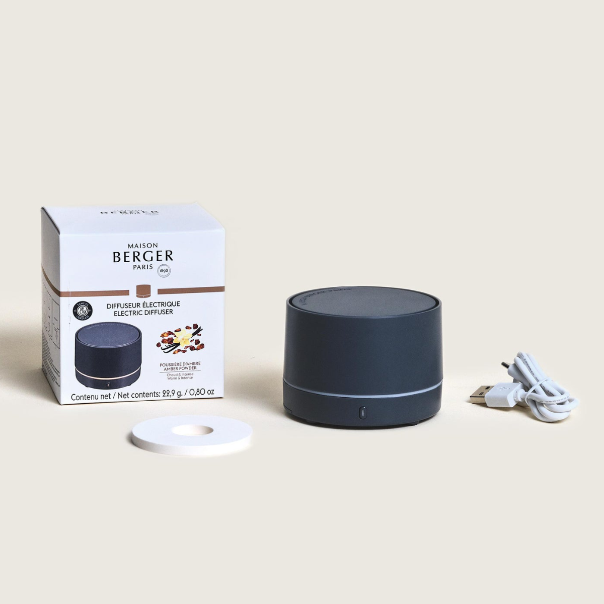 Incluí: Difusor Nomad Cinza; Recarga Amber Powder; Cabo de carregamento;